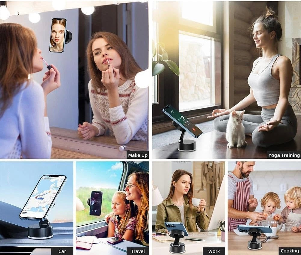 - Support magnétique pour téléphone portable avec rotation à 360° – Support sécurisé pour plusieurs surfaces – Montage solide et stable – Dispose d'une ventouse sous vide de 60 mm de large qui adhère fermement aux surfaces lisses comme les tableaux de bord, le verre et le carrelage. Le mécanisme de verrouillage en une seule étape assure une fixation sûre tout en permettant un retrait facile sans résidus.